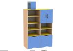 В двух цветовых сочетаниях: стойки бук-натур, фасады светло-синие, полки желтые ИЛИ стойки бук-натур, фасады манго, полки салатовые