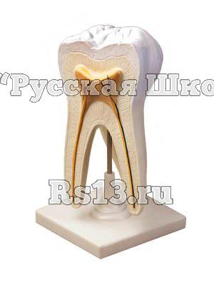 На модели представлены следующие детали строения: коронка зуба, шейка зуба, корень зуба, зубная эмаль, зубная кость (дентин), зубная пульпа, нервы и кровеносные сосуды.